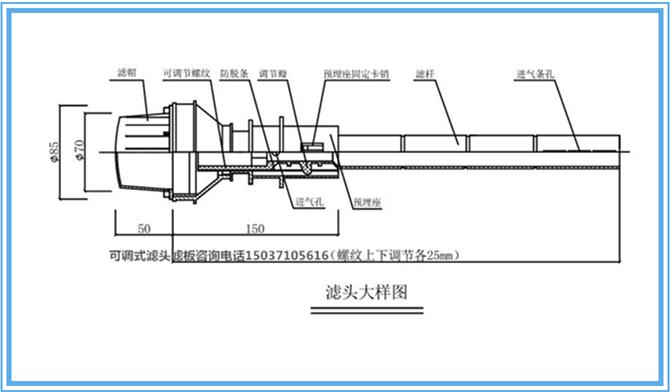 濾桿內(nèi)徑17±0.5mm,帶有外絲扣。濾桿上端設有一個圓形的進氣孔,孔徑2±0.05mm;下端設有一個狹長的進氣孔,孔長度65±0.05mm,寬度1.5±0.05mm。