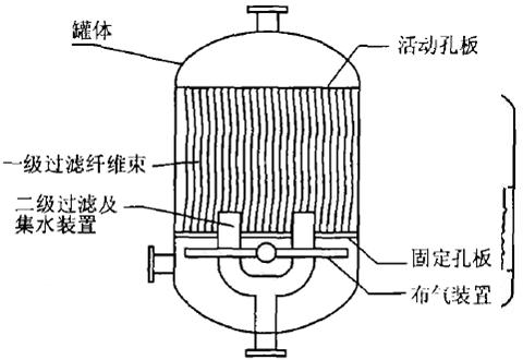 纖維束過濾器濾料采用長1m的纖維,捆扎成束, 固定在上濾盤。上濾盤起布水的作用。反洗開始 時,反洗水從上進水口進入濾罐,從下部流出;下 部升降電動機啟動通過螺旋帶動下托盤下行,松開 纖維束;上部電動機帶動上濾盤交替正反轉(zhuǎn),濾料 在水中受到較大的水流沖刷。過濾時上部旋轉(zhuǎn)停 止,下部升降電動機帶動下托盤上行,壓緊纖維 束。濾液從下部進入,從上部流出。